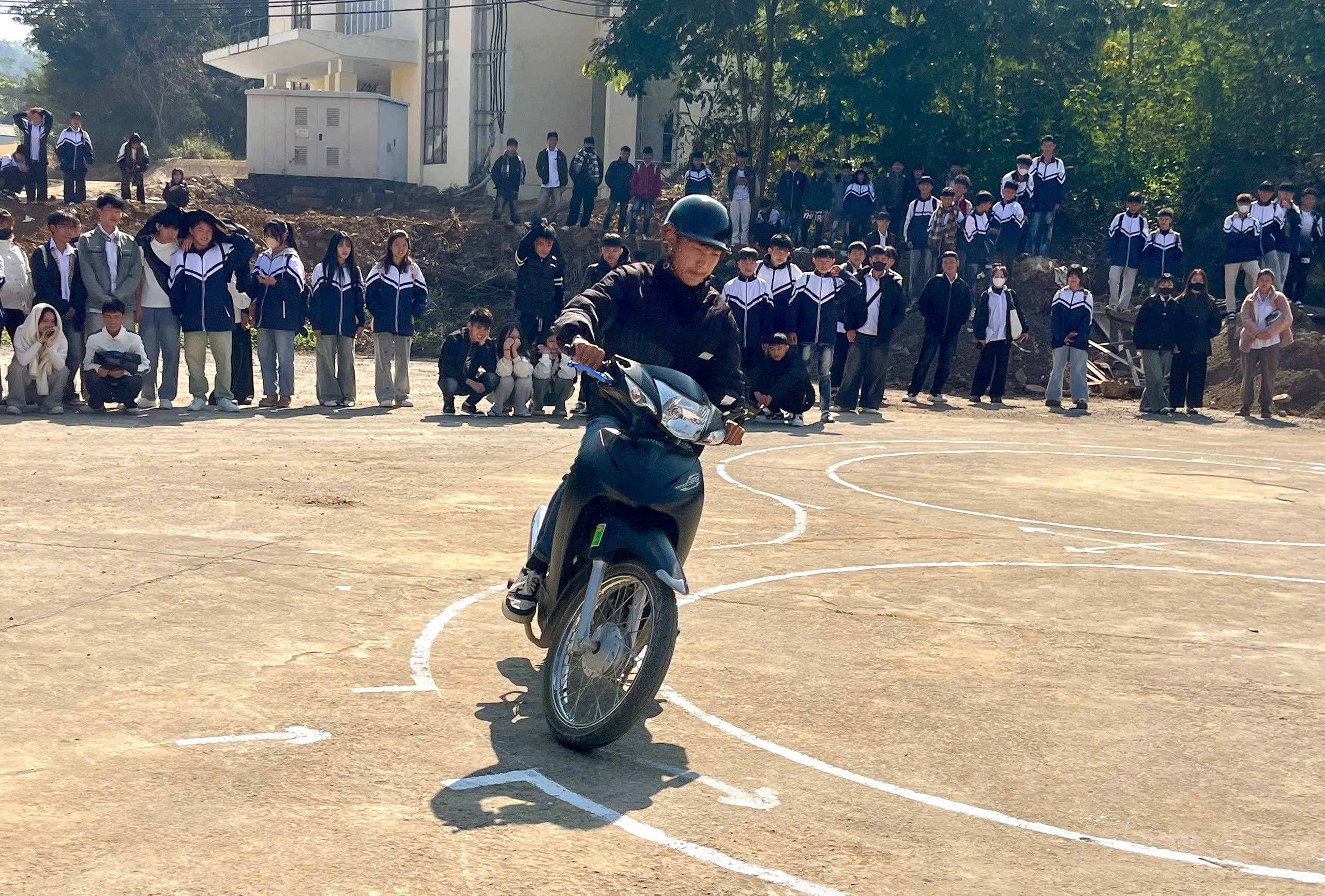 Để giúp học sinh hình dung rõ hơn và vận dụng kiến thức vào thực tế, báo cáo viên còn hướng dẫn học sinh thực hành kỹ năng điều khiển xe gắn máy an toàn trên các địa hình khác nhau (sa hình), kỹ năng phán đoán và xử lý tình huống bất ngờ. Các học sinh được hướng dẫn tận tình, chu đáo và tham gia rất nghiêm túc. Đây là nội dung rất thiết thực giúp củng cố sâu hơn phần lý thuyết học sinh đã được phổ biến ở Hội trường.