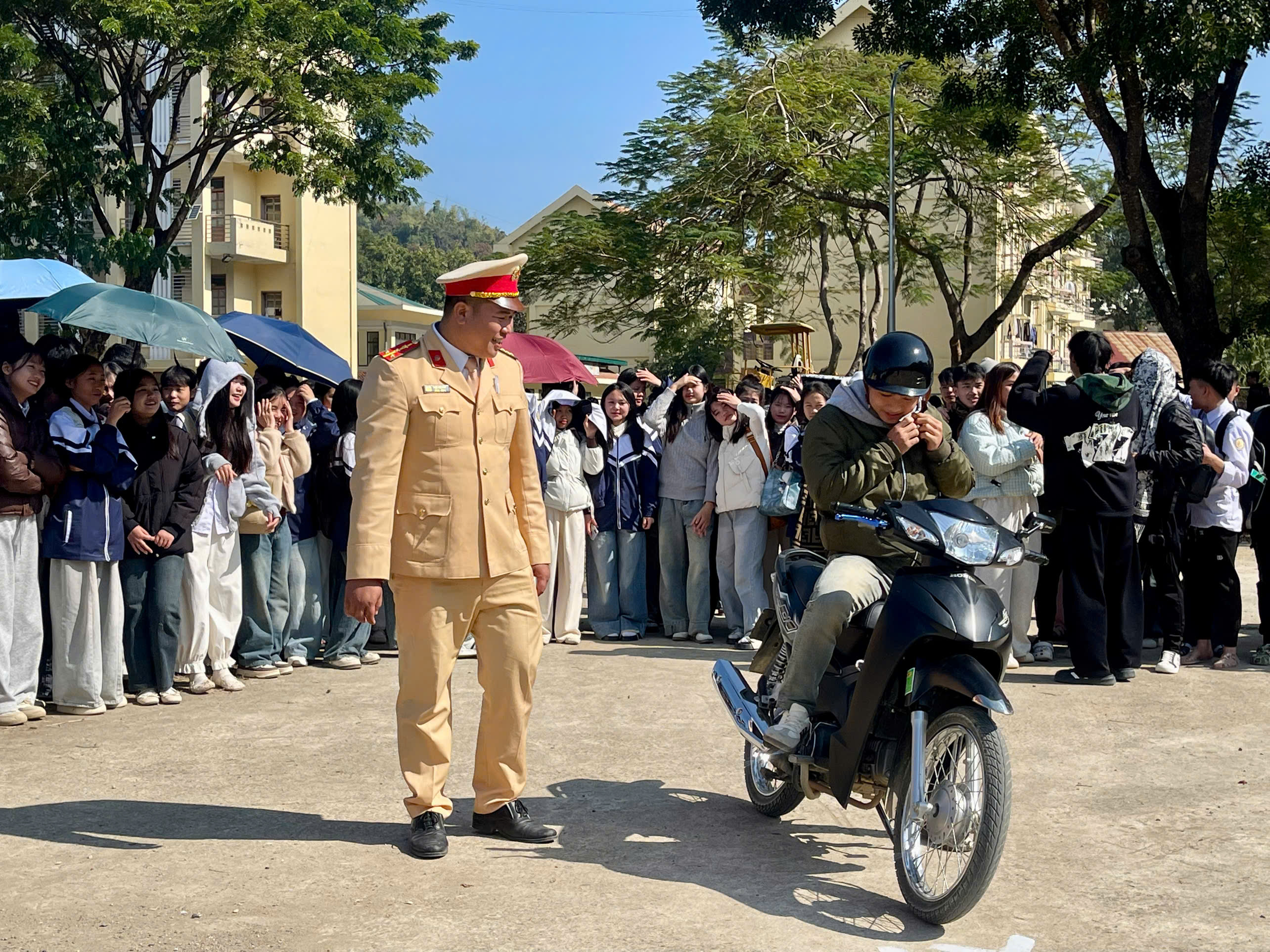 Với mục tiêu nâng cao nhận thức và ý thức chấp hành pháp luật về trật tự, an toàn giao thông đường bộ, đặc biệt là các quy tắc và kỹ năng lái xe gắn máy an toàn cho học sinh, sinh viên, sáng ngày 01/12/2025, tại Hội trường 900, Trường Cao đẳng Sơn La đã phối hợp với Công an tỉnh tổ chức buổi Ngoại khoá Tuyên truyền phổ biến giáo dục pháp luật giao thông đường bộ cho học sinh khối Trung học phổ thông.
