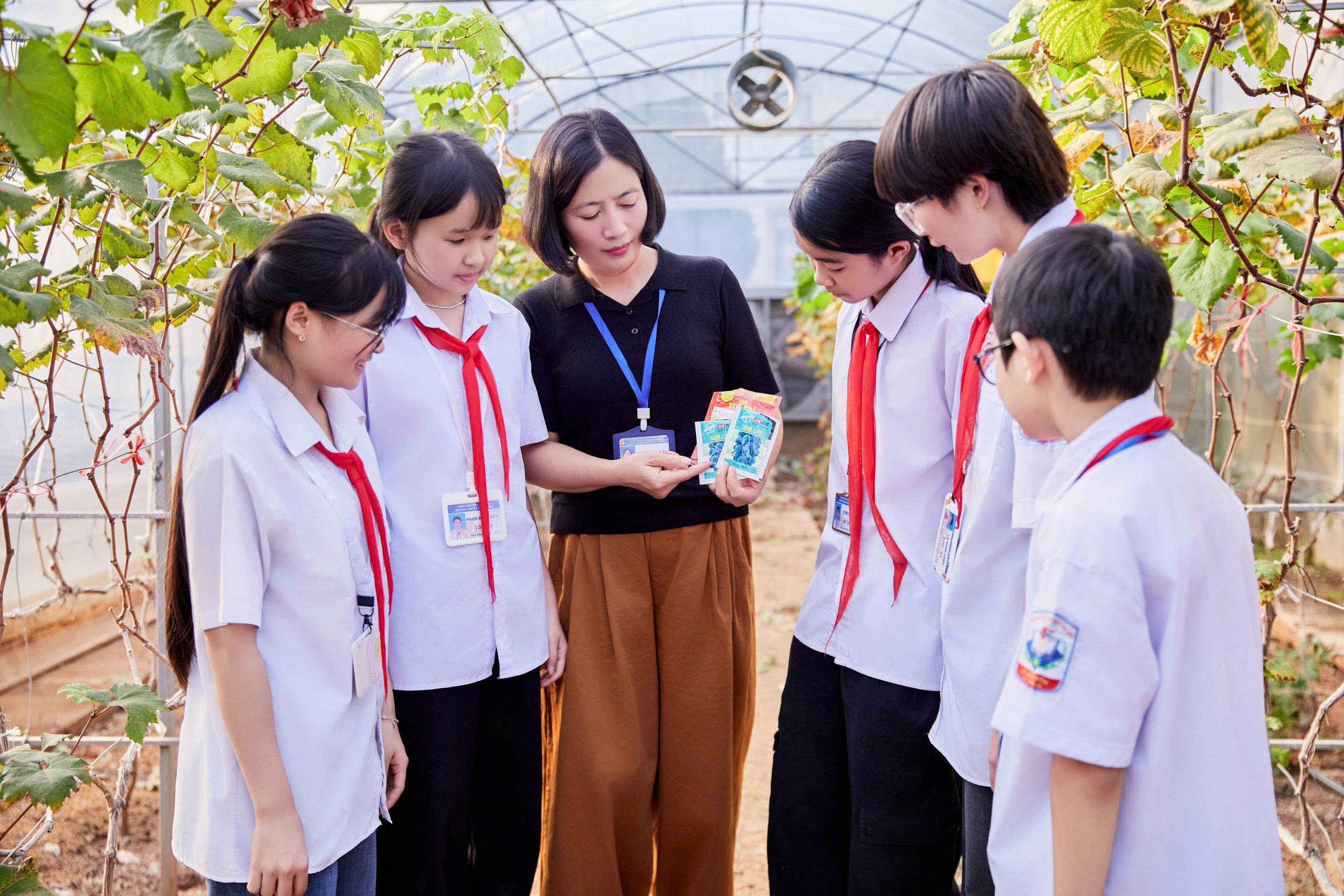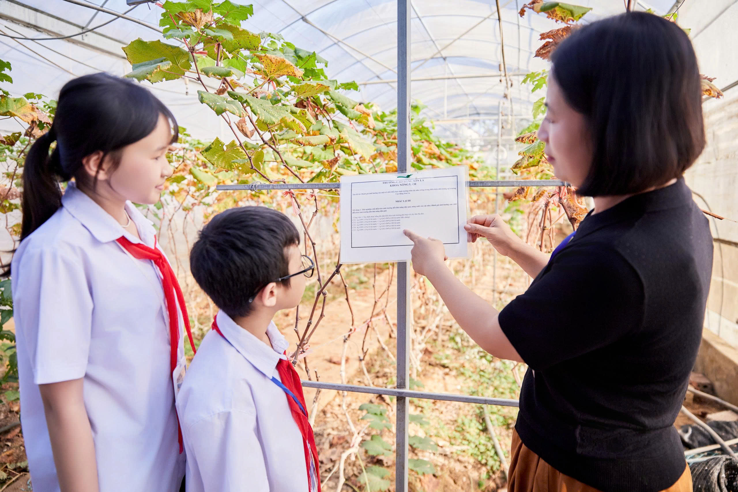 Tại Khu nhà màng, các em học sinh được Giáo viên chủ nhiệm và các Giảng viên khoa Nông Lâm hướng dẫn tìm hiểu hai nội dung chính: Dự án “Trồng cây gia vị bằng phương pháp thủy canh” và Mô hình “Trồng nho Hạ Đen theo hướng hữu cơ trong điều kiện nhà màng”