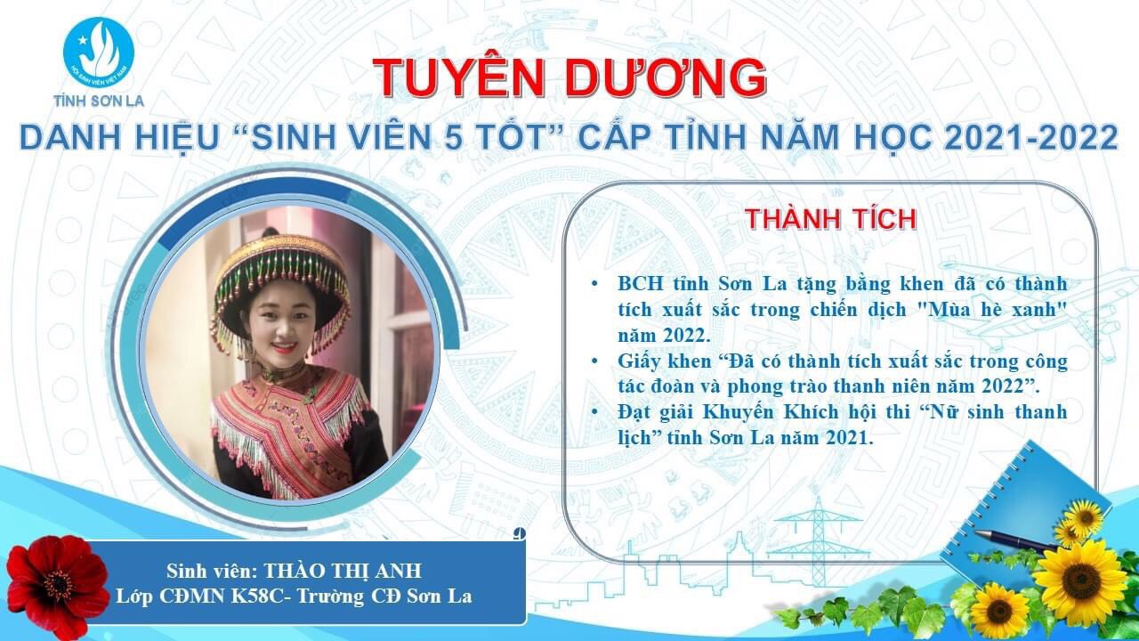 Với những thành tích nổi bật trong năm học 2021 -2022, Thào Anh đã được Hội sinh viên trường Cao đẳng Sơn La và Hội sinh viên tỉnh Sơn La xét duyệt, công nhận trao danh hiệu: "Sinh viên 5 tốt" cấp trường và cấp tỉnh năm 2022.