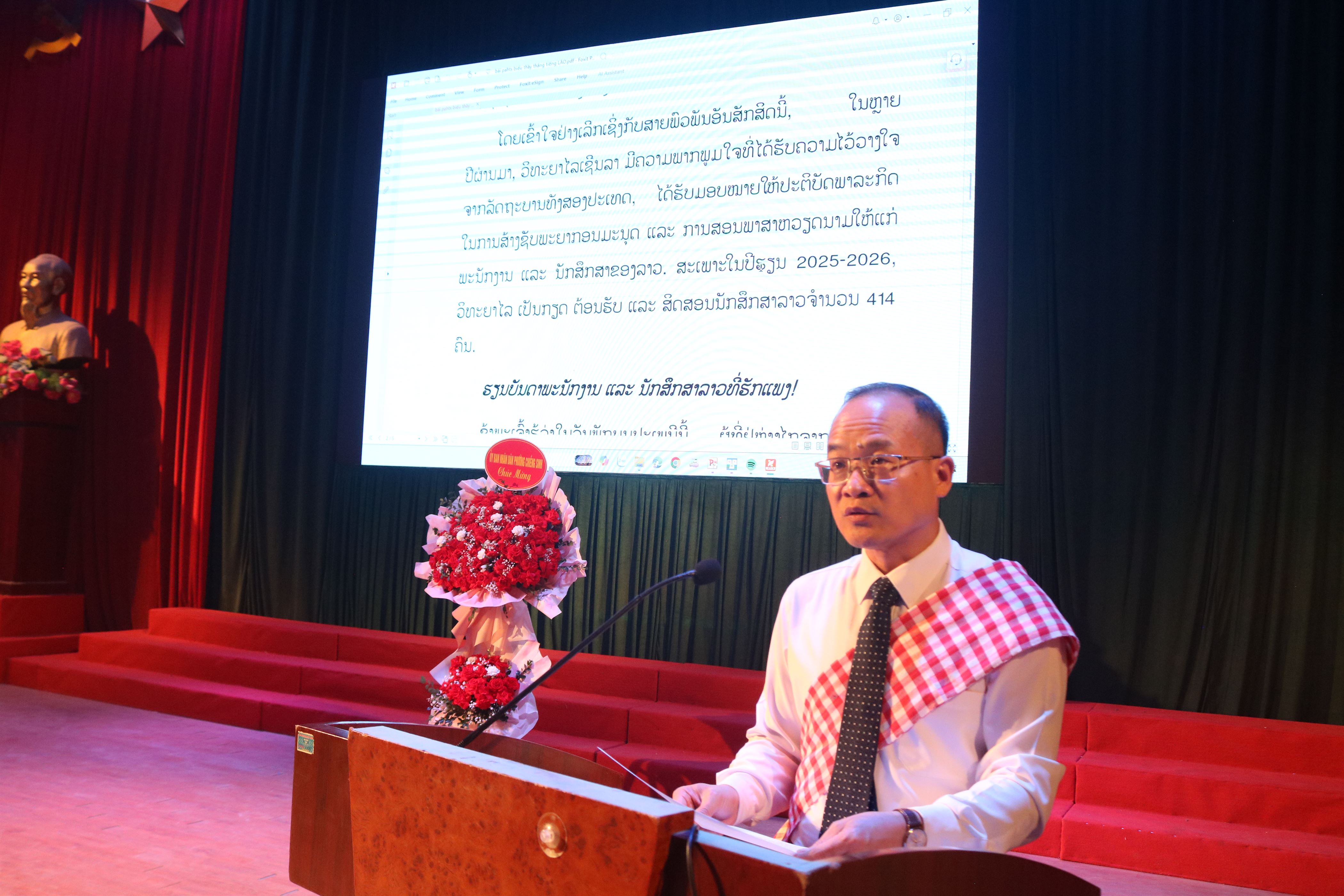 Nhân dịp này, đại diện Sở Ngoại vụ, Đảng uỷ - HĐND - UBND Phường Chiềng Sinh, đại diện Nhà trường và các tập thể trực thuộc Nhà trường đã gửi những lời chúc tốt đẹp nhất và trao tặng nhiều món quà ý nghĩa để chúc mừng các Lưu học sinh, Lưu học viên Lào đang theo học tại trường.