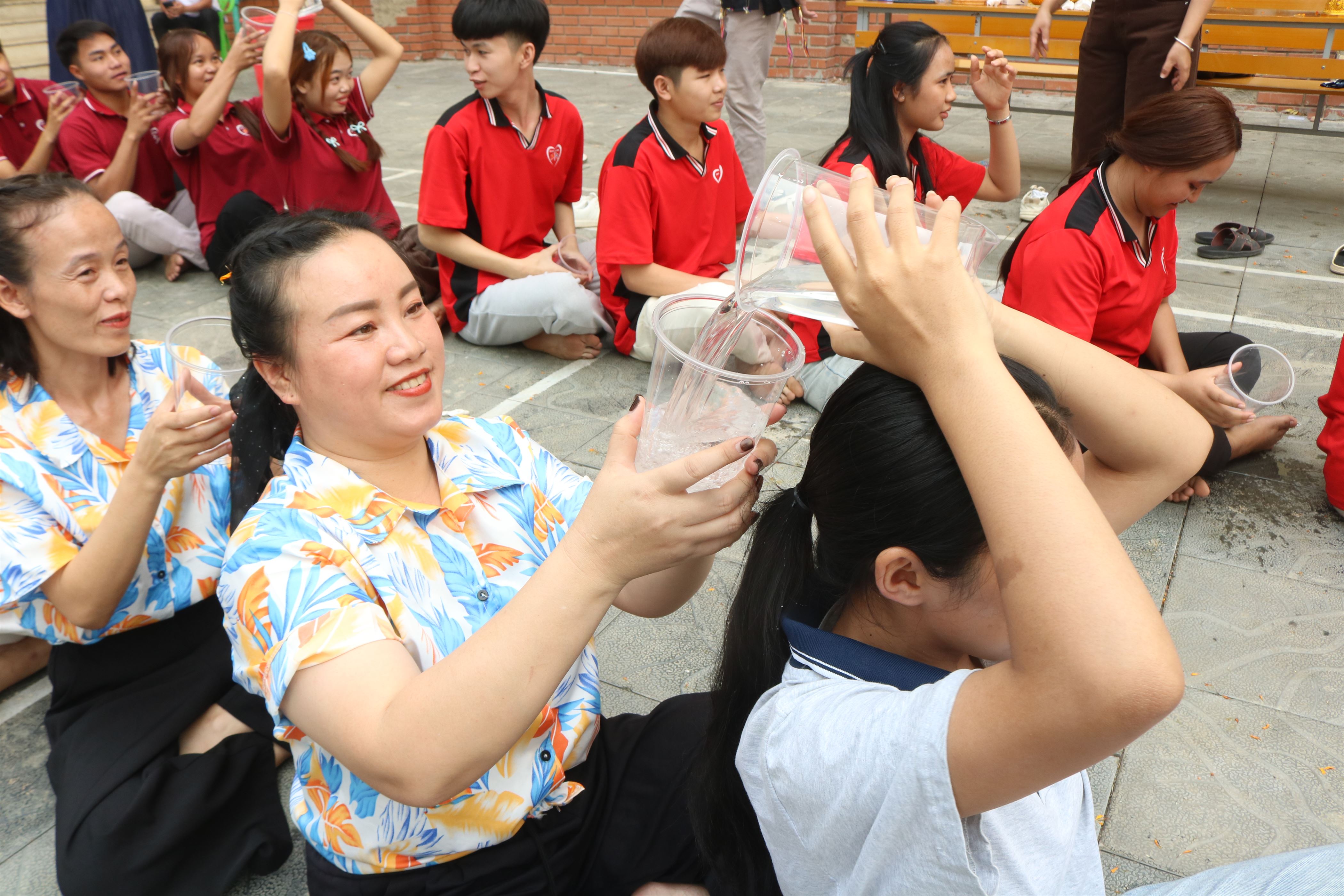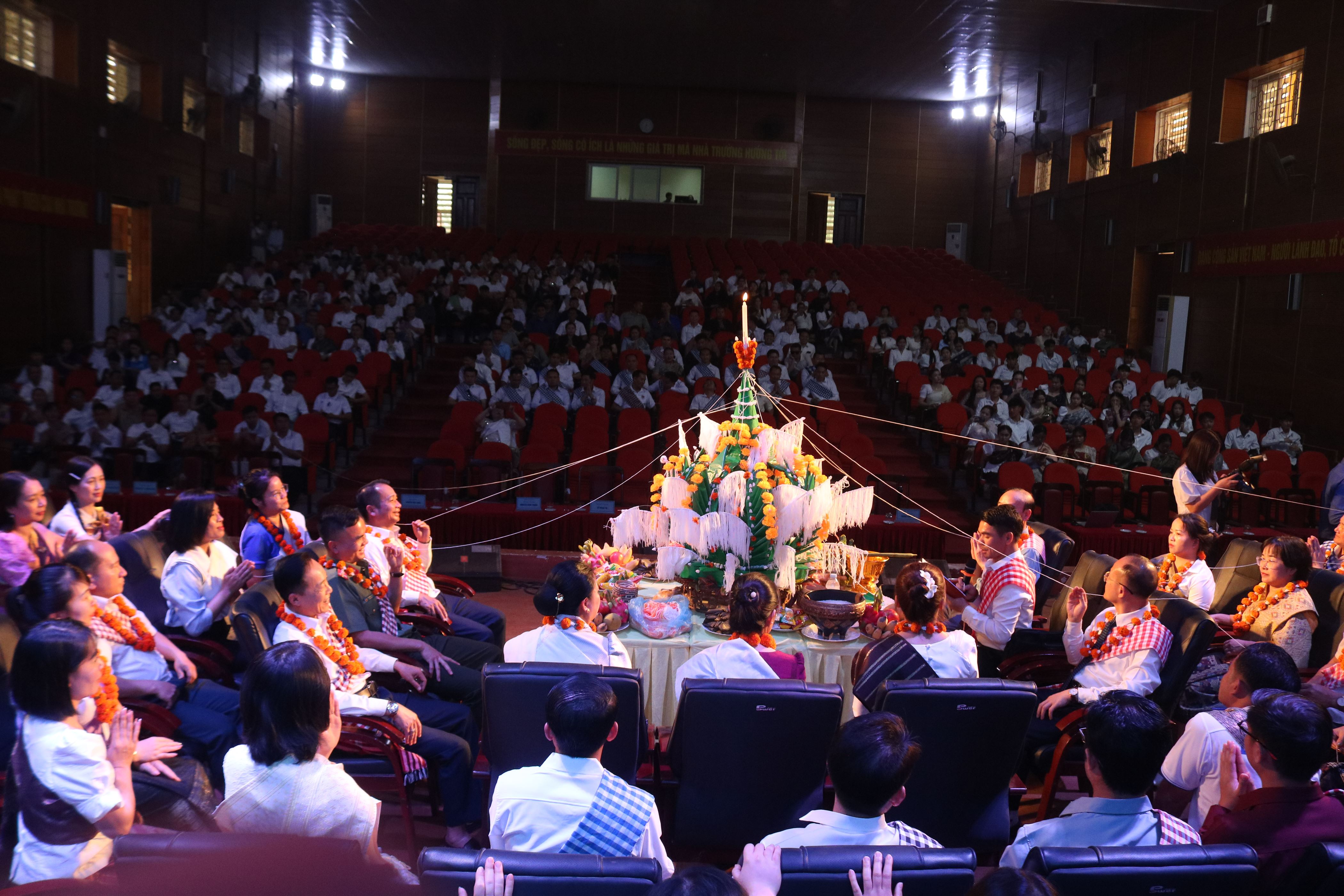 Trong không gian rực rỡ sắc màu văn hóa, các đại biểu cùng cán bộ, giảng viên và học sinh, sinh viên đã cùng thực hiện những nghi thức linh thiêng nhất của ngày Tết Lào: Nghi lễ buộc chỉ cổ tay và Nghi lễ té nước. Từng sợi chỉ hồng được buộc vào cổ tay, từng giọt nước may mắn được trao đi mang theo lời chúc về một năm mới bình an, hạnh phúc và thành công.