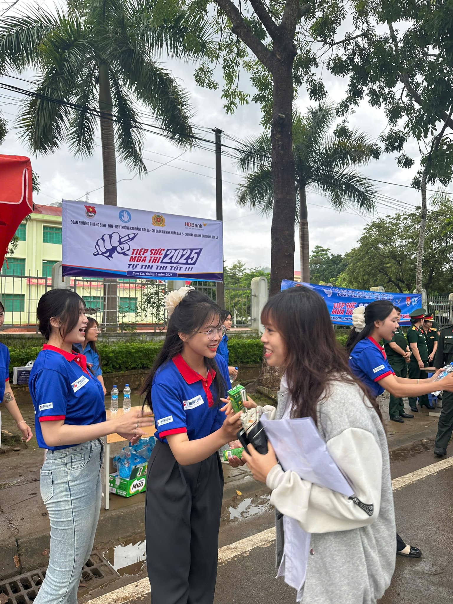 Ngay từ sáng sớm, đội hình áo xanh tình nguyện của Hội Sinh viên Trường Cao đẳng Sơn La đã có mặt tại cổng trường THPT Chiềng Sinh và THPT Chuyên Sơn La. Với nụ cười rạng rỡ và tinh thần trách nhiệm cao, các bạn sinh viên đã nhanh chóng triển khai các hoạt động hỗ trợ thí sinh và người nhà. Khu vực phát nước miễn phí, quạt mát, khẩu trang y tế và các dụng cụ học tập cần thiết khác được bố trí gọn gàng, thuận tiện. Điều đặc biệt là các bạn tình nguyện viên còn chủ động hỗ trợ hướng dẫn đường đi, phòng thi, giải đáp thắc mắc và trấn an tinh thần cho các sĩ tử trước giờ "G".
