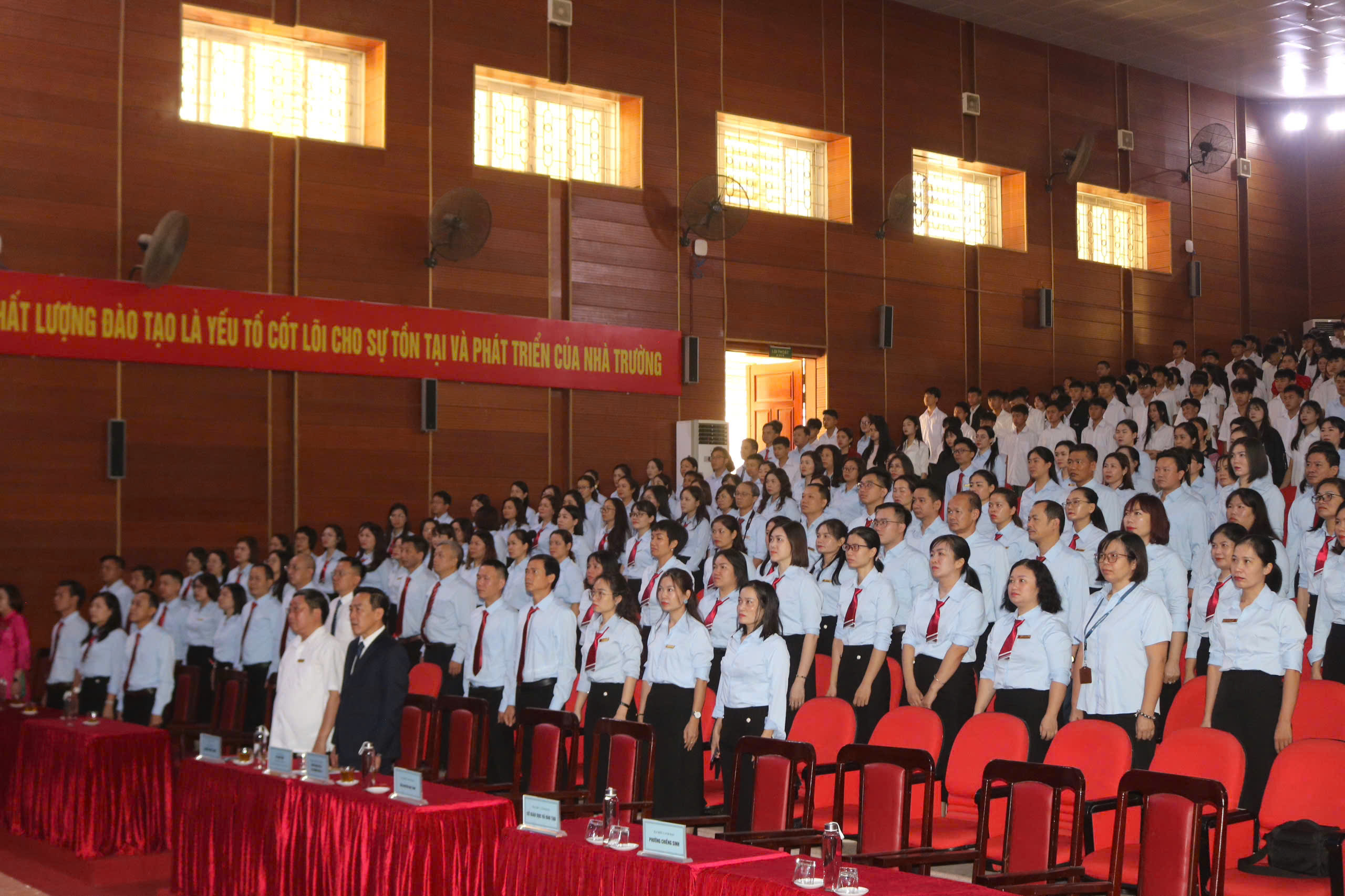 Các đại biểu và các thầy cô giáo, học sinh, sinh viên cùng nhau thực hiện nghi thức Chào cờ, hát Quốc ca