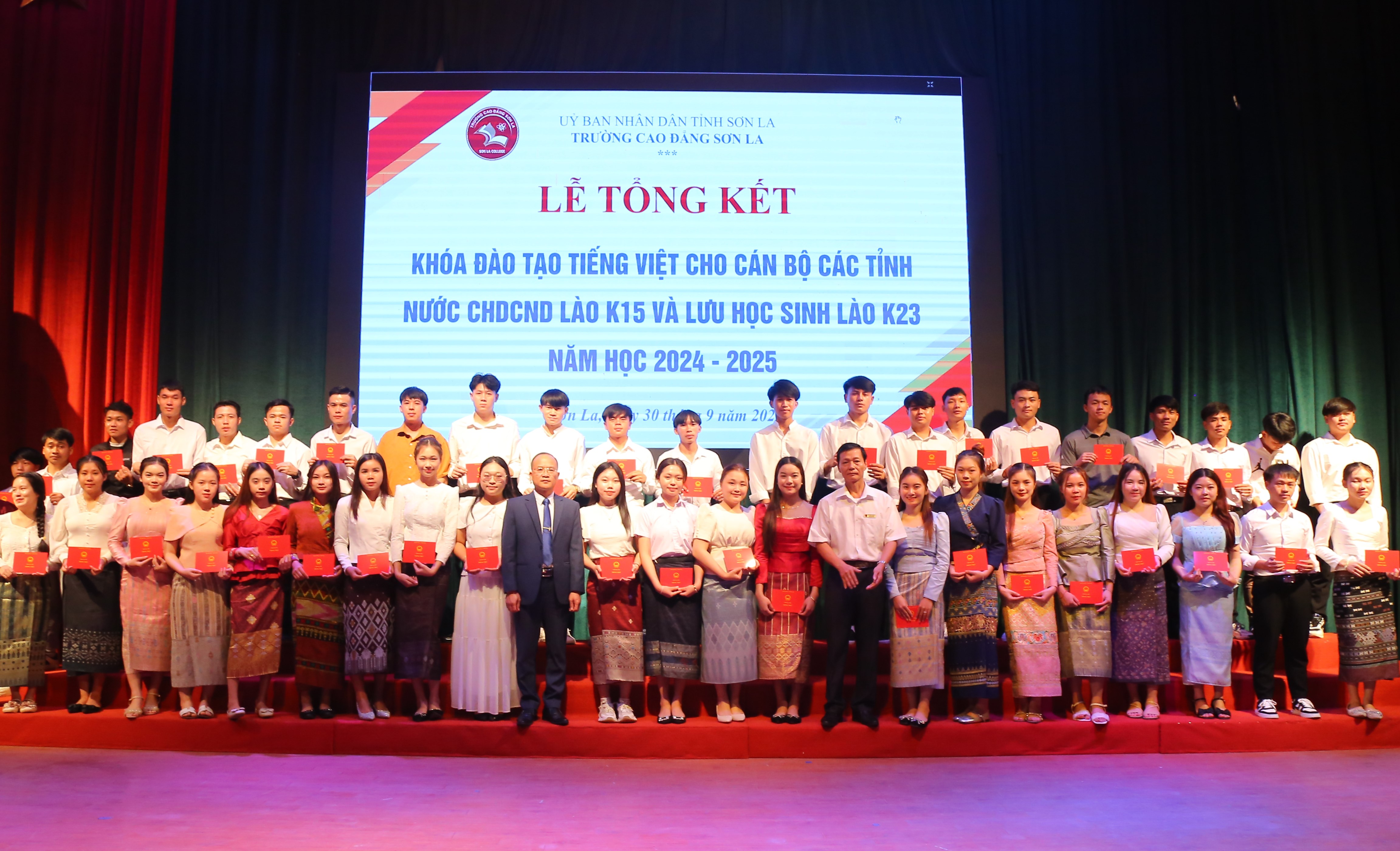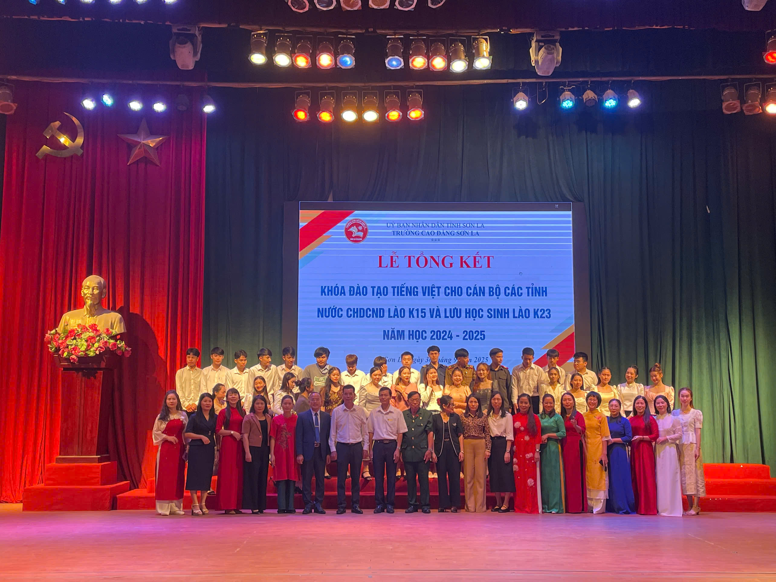 Sáng ngày 30/9/2025, tại Hội trường 900, Trường Cao đẳng Sơn La đã trang trọng tổ chức Lễ Tổng kết khóa đào tạo tiếng Việt cho lưu học viên là cán bộ nước CHDCND Lào K15 và lưu học sinh Lào K23 năm học 2024 – 2025. Buổi lễ diễn ra trong không khí ấm áp, thắm tình hữu nghị, với sự tham dự của đại diện Tỉnh ủy, HĐND, UBND tỉnh Sơn La; các sở, ban, ngành; đại diện Trường Chính trị tỉnh, Trường Đại học Tây Bắc, Trường Cao đẳng Y tế Sơn La; cùng Ban Giám hiệu, cán bộ, giảng viên nhà trường và toàn thể 207 lưu học viên, lưu học sinh Lào tham gia khóa học.