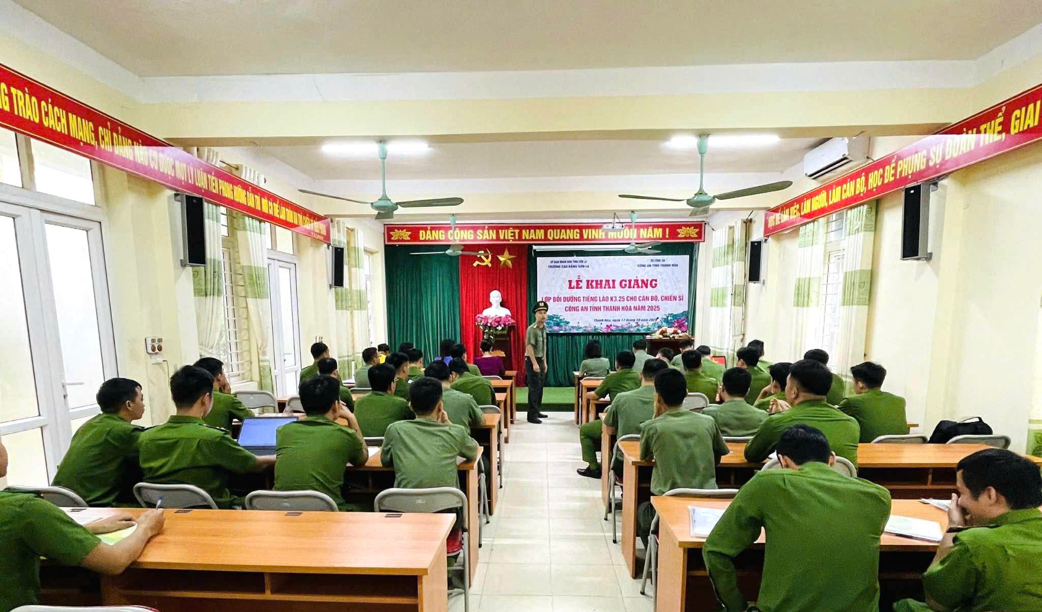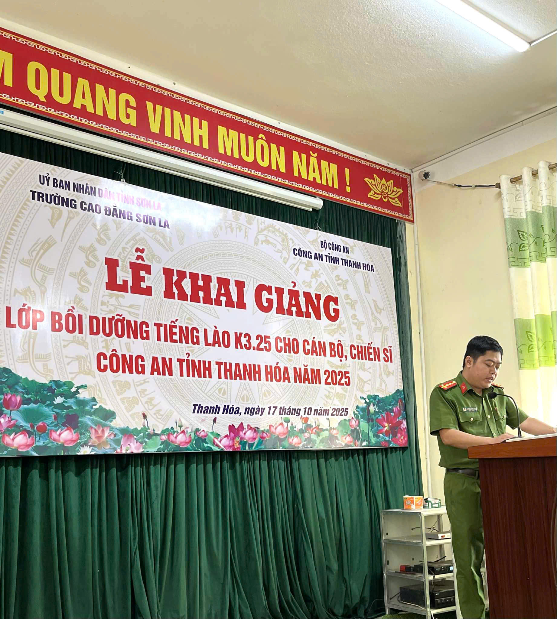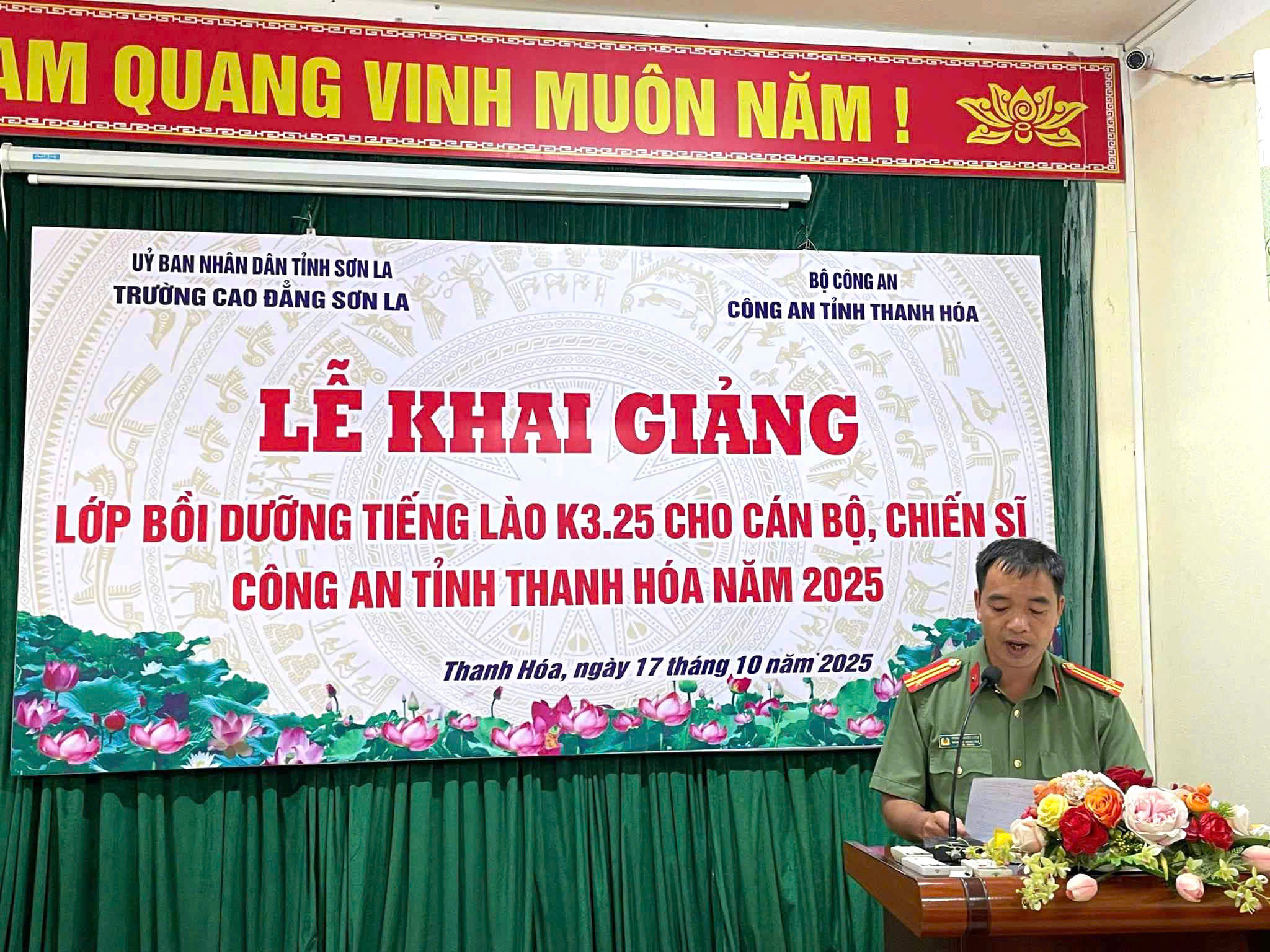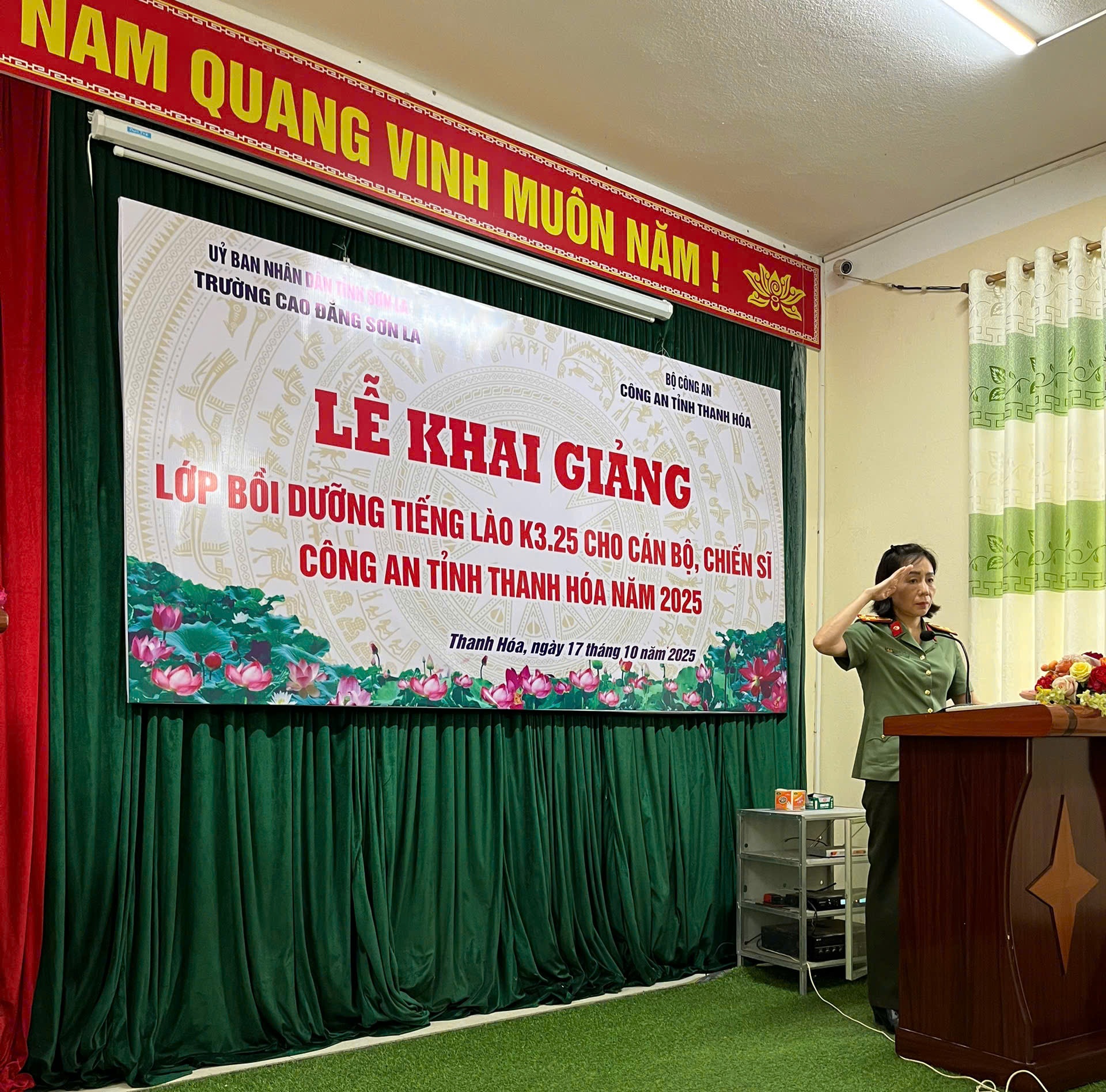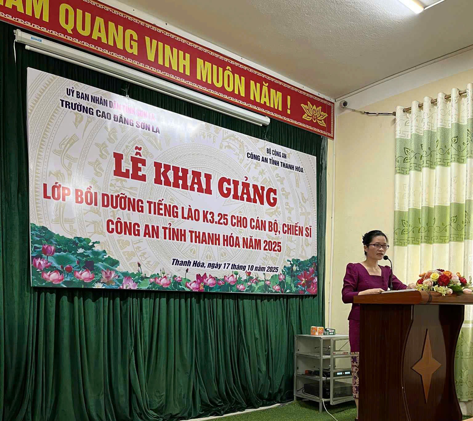 Phát biểu tại buổi lễ, bà Lò Mai Thoan – Trưởng khoa Bồi dưỡng, Trường Cao đẳng Sơn La, thay mặt nhà trường chúc mừng các học viên tham gia khóa học, đồng thời bày tỏ niềm vinh dự khi tiếp tục được phối hợp với Công an tỉnh Thanh Hóa trong công tác đào tạo, bồi dưỡng ngoại ngữ. Bà nhấn mạnh: “Khóa bồi dưỡng tiếng Lào khóa K3.25 không chỉ giúp cán bộ, chiến sĩ Công an tỉnh Thanh Hóa trau dồi kỹ năng giao tiếp cơ bản bằng tiếng Lào, mà còn góp phần tăng cường khả năng phối hợp, hiểu biết văn hóa và vun đắp mối quan hệ hữu nghị đặc biệt Việt – Lào. Nhà trường cam kết đảm bảo chất lượng giảng dạy, tạo điều kiện thuận lợi nhất để học viên hoàn thành khóa học đạt kết quả cao.”
